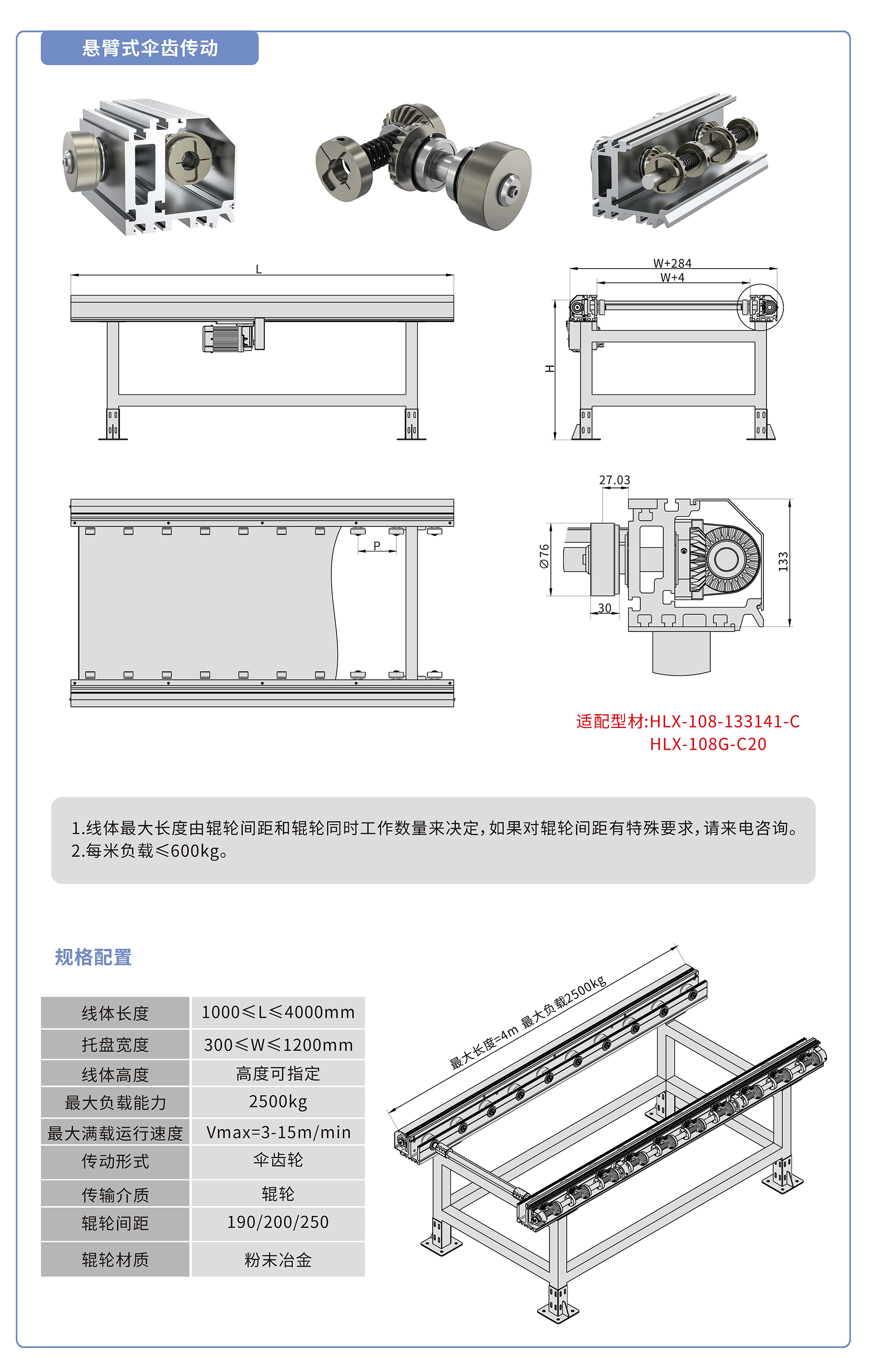采用133141鋁型材,傘齒驅(qū)動,粉末冶金滾輪鑲嵌銅套實現(xiàn)積放功能,負(fù)載2500kg/米,最大負(fù)載速度15M/min, 輪距190、200、250可選,適用托盤寬度300-1200mm,線體長度范圍1000-4000mm, 高度根據(jù)需求定制.