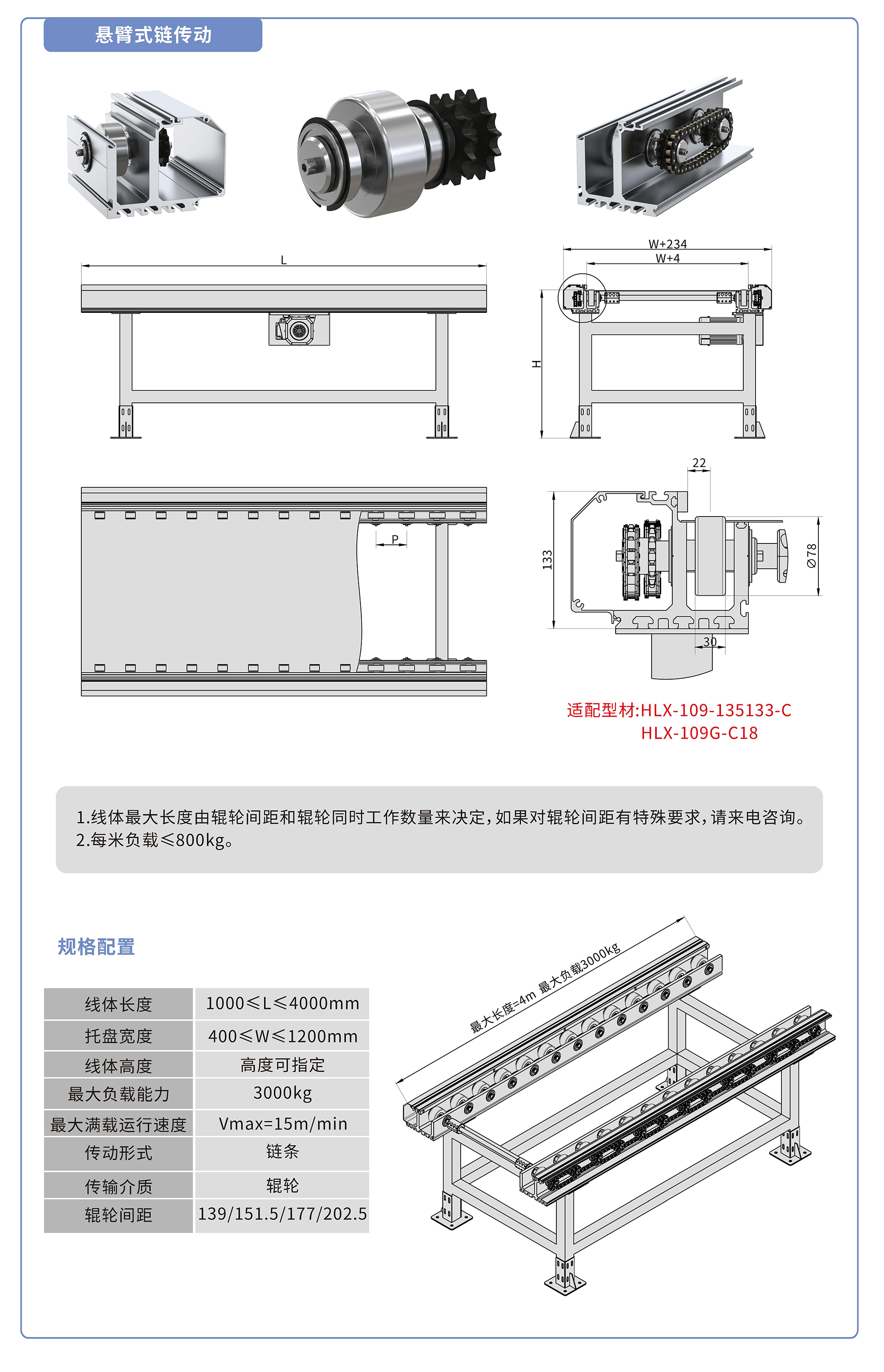 采用135133鋁型材,鏈輪傳動(dòng),鍍鉻滾輪鑲嵌銅套實(shí)現(xiàn)積放功能,負(fù)載3000kg/米,最大負(fù)載速度15M/min, 輪距139、151.5、177、202.5可選,適用托盤(pán)寬度400-1200mm,線(xiàn)體長(zhǎng)度范圍1000-4000mm, 高度根據(jù)需求定制.