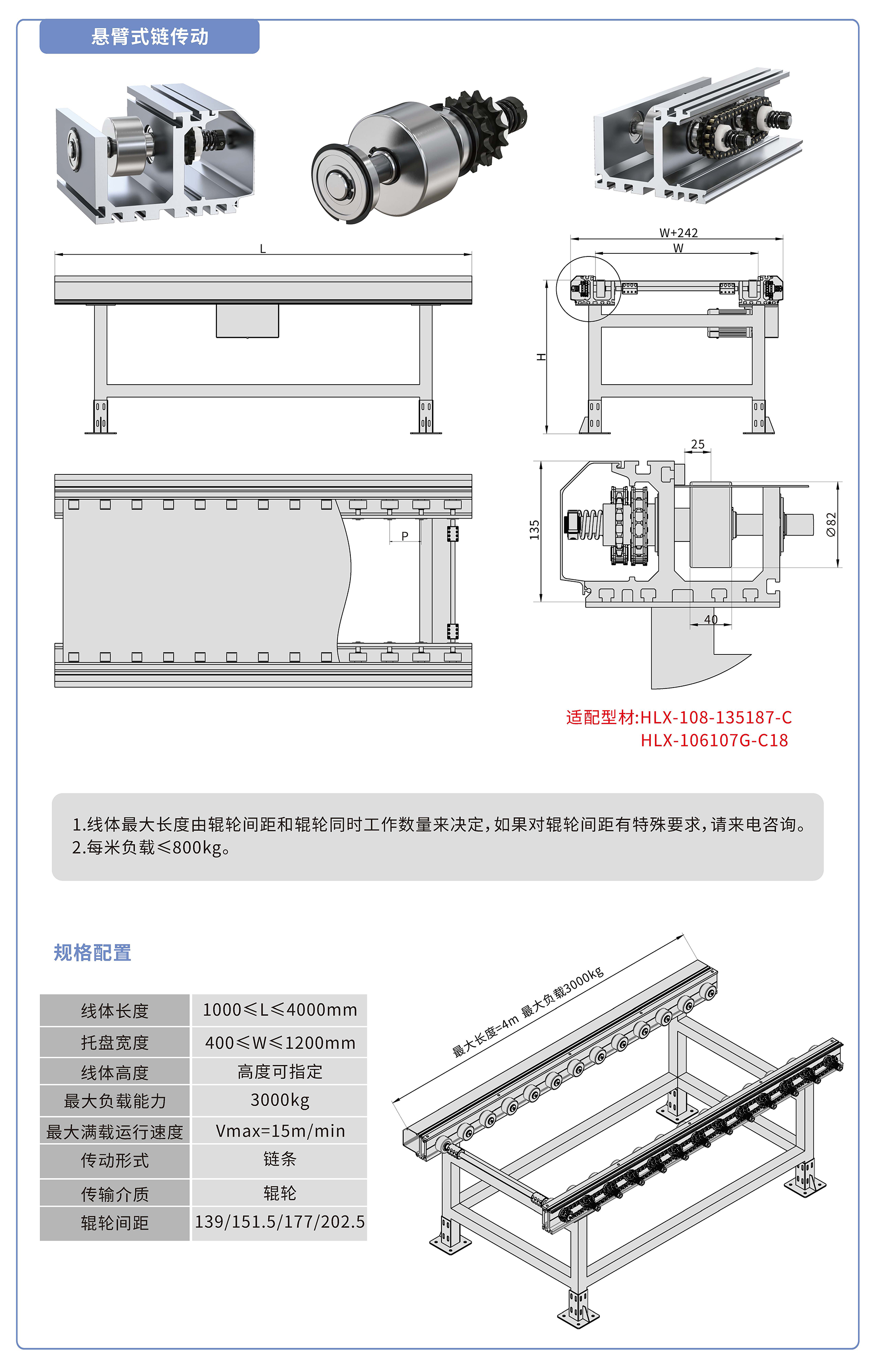 采用135187鋁型材,鏈輪傳動,鍍鉻滾輪鑲嵌銅套實現(xiàn)積放功能,負載3000kg/米,最大負載速度15M/min, 輪距139、151.5、177、202.5可選,適用托盤寬度400-1200mm,線體長度范圍1000-4000mm, 高度根據(jù)需求定制.