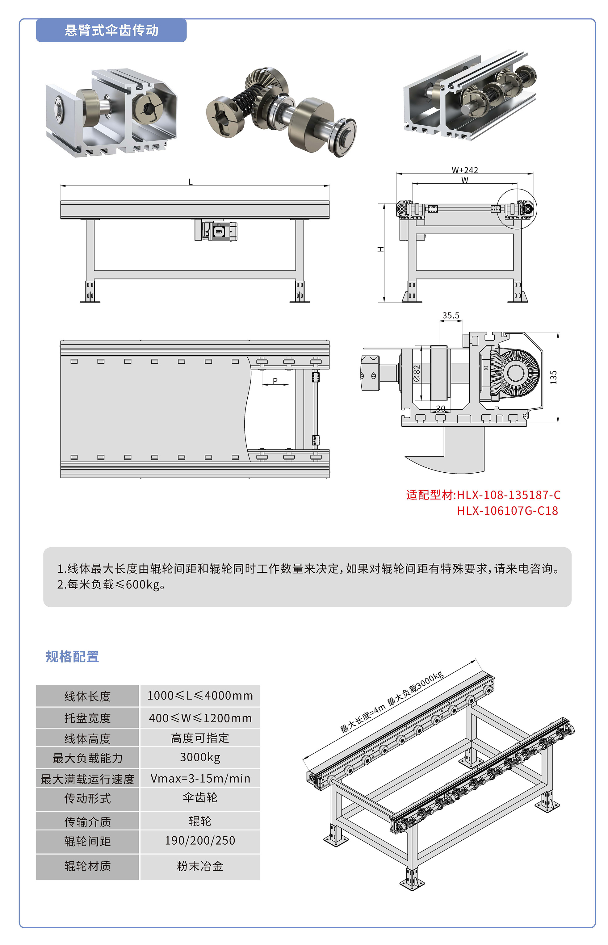 采用135187鋁型材,傘齒驅(qū)動,粉末冶金滾輪鑲嵌銅套實(shí)現(xiàn)積放功能,負(fù)載3000kg/米,最大負(fù)載速度15M/min, 輪距190、200、250可選,適用托盤寬度400-1200mm,線體長度范圍1000-4000mm, 高度根據(jù)需求定制.