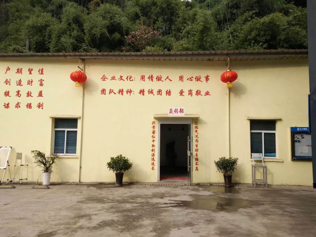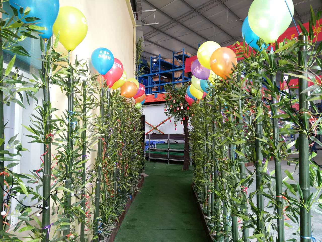 張燈結彩,彩旗飄飄-好山好水好地方好彩頭 陽光普灑在匯利興墻面上紅彤彤的燈籠兒掛立兩旁彰顯著匯利興紅火的前方,進而也突顯著匯利興企業(yè)文化與團隊精神同時也在溫暖著匯利興人的心 精神抖擻的匯利興人在認真的工作 綠草青竹有著無顏六色的彩帶與氣球兒的點綴成為了一顆璀璨耀眼的明珠,一個“世外竹源”。