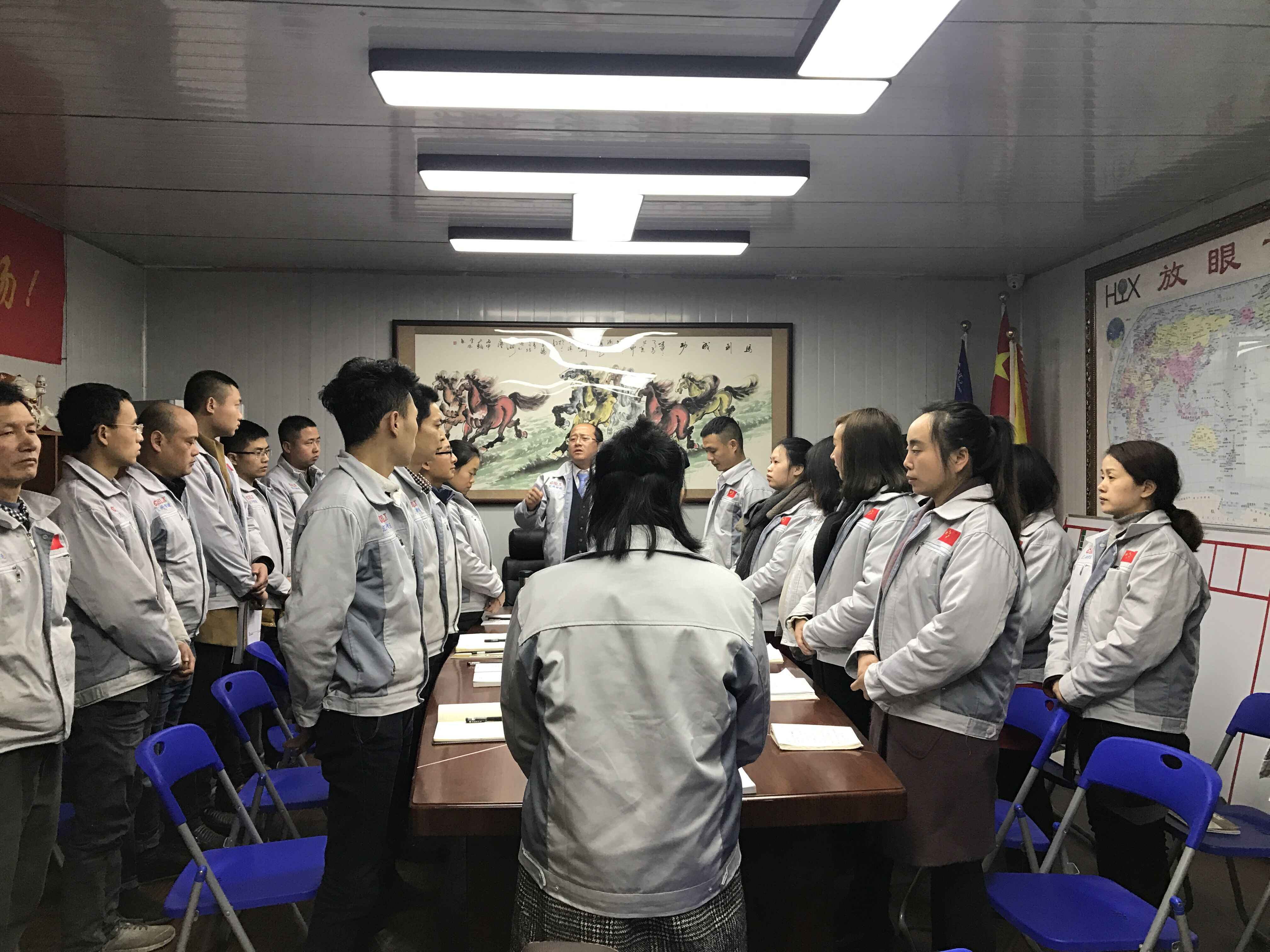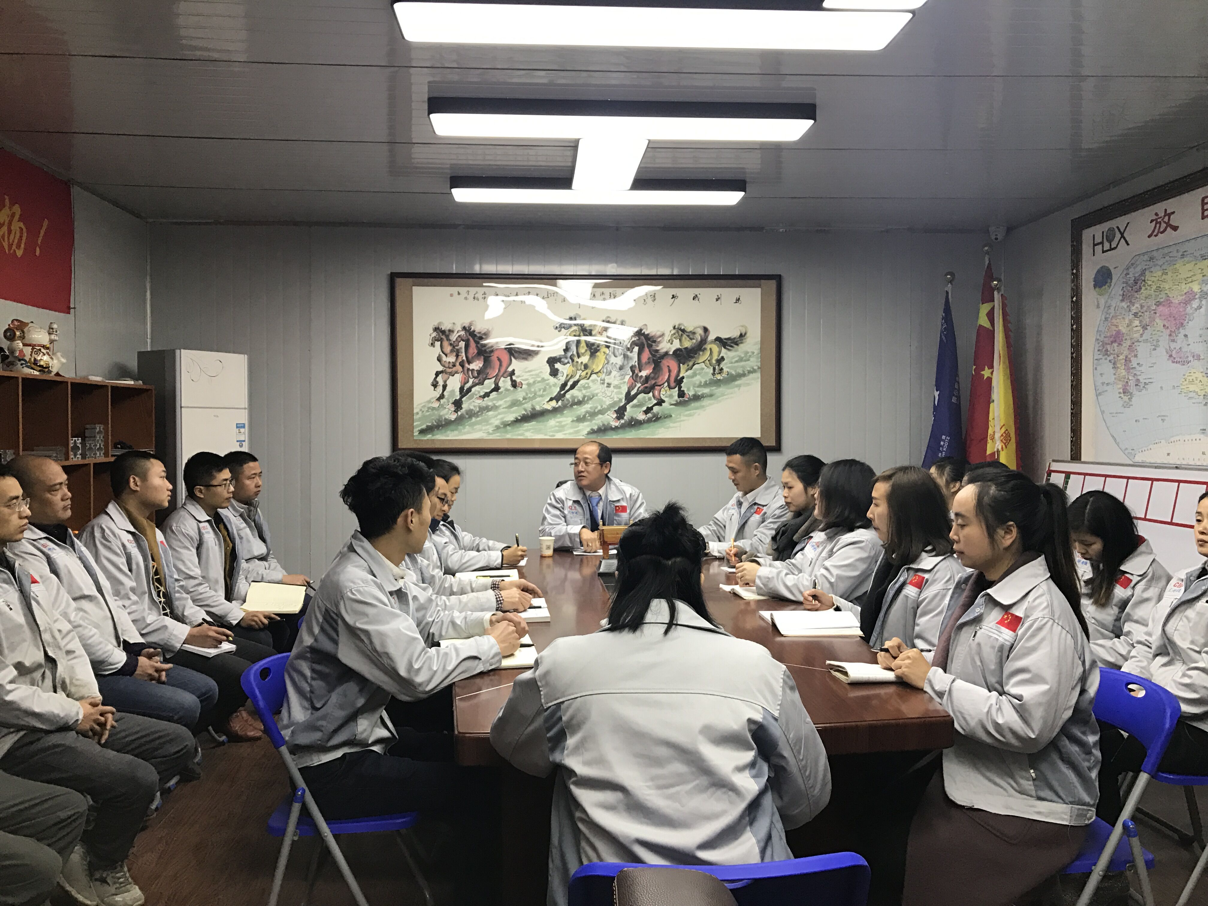 2月27日,匯興智造董事長鐘輝先生蒞臨重慶匯利興子公司考察并指導(dǎo)工作。重慶子公司全體人員對(duì)鐘董事長的到來表示熱烈歡迎,并于12點(diǎn)30分由鐘董事長領(lǐng)導(dǎo)召開會(huì)議。 鐘董事長在會(huì)議上做相應(yīng)會(huì)議的闡述 展望未來、登高望遠(yuǎn)。會(huì)上,鐘董事長首先提到兩個(gè)特質(zhì)“智慧與力量”,進(jìn)而談到企業(yè)的擁抱變化及展望未來,并切身實(shí)際談到匯興智造所擁抱的變化及所具備的十三大體系的升級(jí)(客戶、產(chǎn)品、設(shè)備、工具、管理、名字、品牌、宣傳等);進(jìn)而也公布公司近段時(shí)間一系列喜訊事宜并讓我們感受到公司前進(jìn)步伐的節(jié)奏感及時(shí)效感,同時(shí)表示國家一系列政策對(duì)我司的大力支持與鼓勵(lì),并談及到平臺(tái)的力量,品牌的力量”。 全體人員用士氣唱響心中的船(匯利興) 鐘董事長說道:公司”倍增計(jì)劃”是以內(nèi)伸與外延相結(jié)合發(fā)展進(jìn)而勉勵(lì)我們:在崗也應(yīng)在職,在職也應(yīng)在職,且人因夢(mèng)想而偉大,以走一步看兩步想三步為理念朝著目標(biāo)努力奔跑。隨機(jī)應(yīng)變,有配而來,整個(gè)會(huì)議以“匯利興是我們的船而我們?cè)诖稀钡膮群奥晝航Y(jié)束,但那一聲聲強(qiáng)大的聲音滲透在匯利興人每個(gè)人的腦海,將永不停歇。