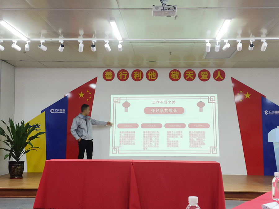 會議第一項議程,企業(yè)文化宣讀。全體人員整肅衣冠,對倍加推崇的三道文化“孝道、商道、人道”鄭重鞠躬,莊嚴(yán)宣誓企業(yè)愿景:“成為行業(yè)優(yōu)秀的智能自動化產(chǎn)業(yè)鏈集成服務(wù)商”,企業(yè)使命:做受尊敬的好人,造受尊敬的產(chǎn)品,辦受尊敬的企業(yè),建受尊敬的平臺,企業(yè)精神“用情做人、用心做事”,團(tuán)隊精神“忠誠團(tuán)結(jié)、勤奮進(jìn)取”,工匠精神:創(chuàng)于手、精于工、智于器、匠于心、品于行等。 會議第二項議程,胡總結(jié)理作2020年度銷售總結(jié)暨2021年工作計劃。通過四個章程(一、年度工作概述、二、年度完成情況、三、業(yè)態(tài)及成果、四、工作不足,五、2021工作計劃及策略),依次對2020年度銷售情況進(jìn)行深度分析。 第一章,工作概述。胡總通過以下四點(diǎn)來詮釋年度工作整體情況,1.公司實力板塊上升、目標(biāo)達(dá)成率高;2.匯利興自落地西南片區(qū)十年歷程以來,行業(yè)口碑逐漸上升;3.通過以“個人積極性、鍛造創(chuàng)新能力、延伸產(chǎn)業(yè)鏈”等行為上對團(tuán)隊進(jìn)行了深度的剖析,指出在面對新環(huán)境的挑戰(zhàn)下,團(tuán)隊要以創(chuàng)機(jī)遇抓機(jī)會的思想決策持續(xù)開展各項工作;4.自覺、自律、自勵——銷售部全員不斷在學(xué)習(xí)成長,用所學(xué)習(xí)的專業(yè)知識助力公司奔跑前行。自覺完成每次公司的委托,自律完成每一次托付,自勵督促自己蛻變成長!