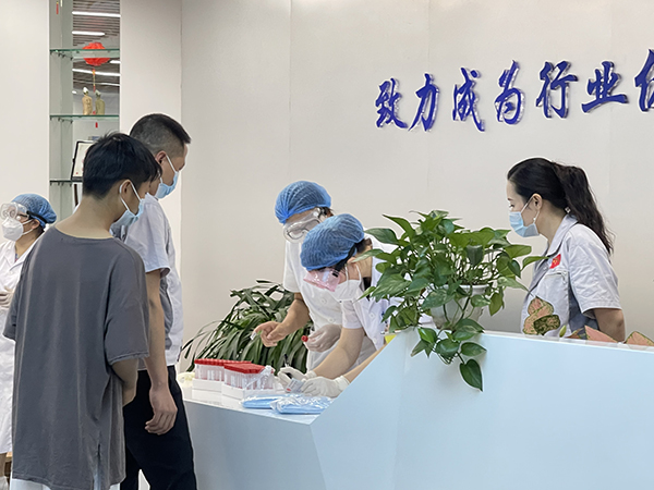 為加強(qiáng)新冠肺炎疫情防控工作 ,有效實(shí)施對(duì)新冠肺炎的預(yù)防、控制工作,保證員工健康安全。匯利興西南工廠積極響應(yīng)國(guó)家防疫號(hào)召,主動(dòng)做好疫情防控工作,于2021年8月7日上午為全體員工開(kāi)展核酸檢測(cè),為全體員工的安全健康加上一層“防護(hù)盾”,確保全體員工都能以健康的身體、積極的心態(tài)投入工作中,進(jìn)一步為疫情防控企業(yè)做好疫情防控榜樣。 疫情防控,人人有責(zé)。為確保疫情防控和安全生產(chǎn)工作兩不誤原則,同時(shí)盡最大努力降低員工外出感染的風(fēng)險(xiǎn),行政部提前與醫(yī)院進(jìn)行溝通銜接,通過(guò)采取醫(yī)院派醫(yī)務(wù)人員到廠區(qū)內(nèi)進(jìn)行采樣的方式,為員工安全健康保駕護(hù)航。 檢測(cè)現(xiàn)場(chǎng),醫(yī)務(wù)人員嚴(yán)格執(zhí)行檢測(cè)流程,對(duì)每一位參檢人員進(jìn)行實(shí)名登記驗(yàn)證,填寫(xiě)樣本采集申請(qǐng)單,發(fā)放檢測(cè)工具。為防止人員扎堆聚集,等候人員都需間隔1米以上,以部門分批次、分時(shí)段進(jìn)行檢測(cè),并反復(fù)核對(duì)個(gè)人信息并記錄,確保信息準(zhǔn)確無(wú)誤。
