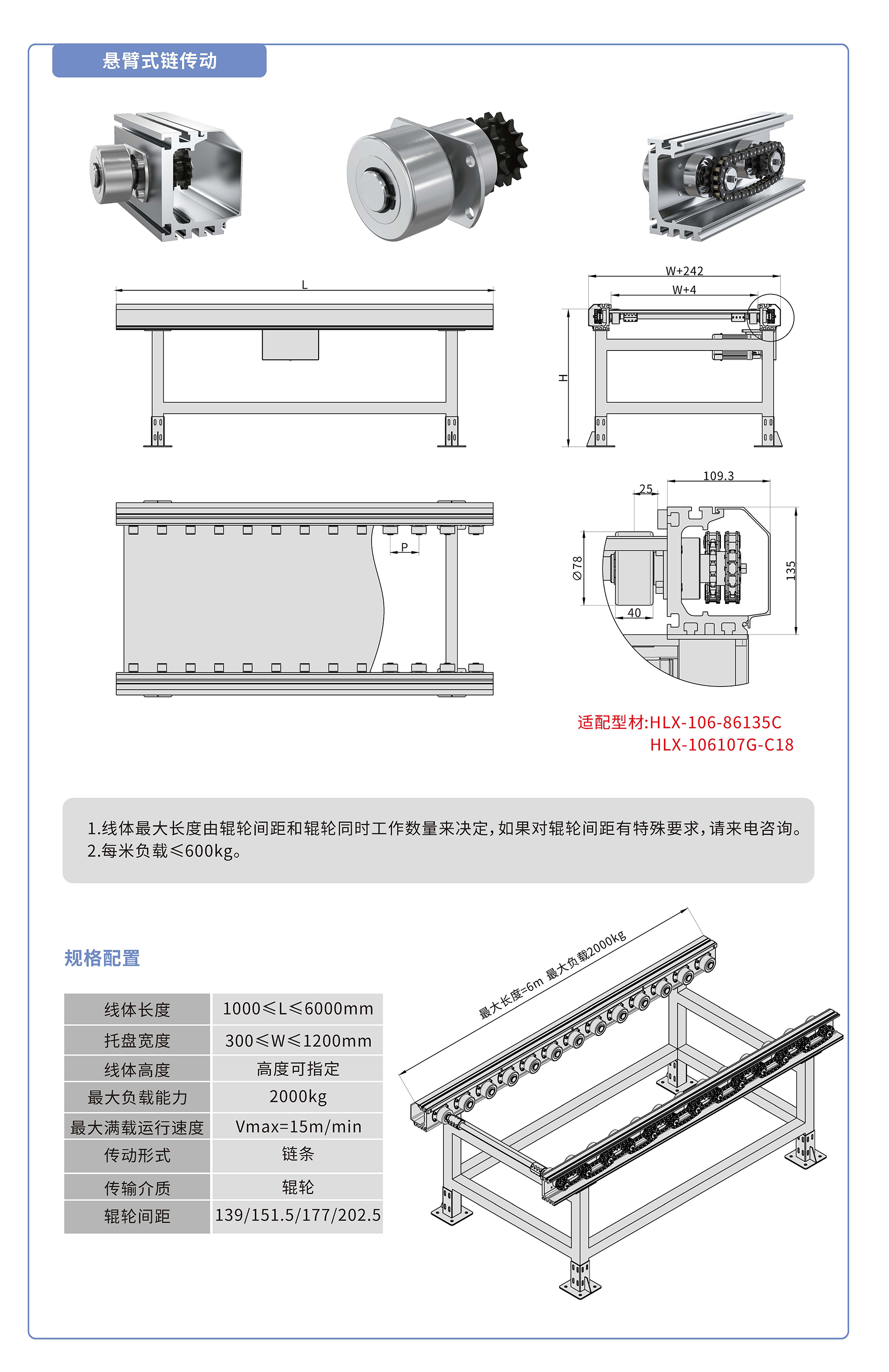 懸臂式鏈傳動(dòng):采用86135鋁型材,鏈輪傳動(dòng),鍍鉻滾輪鑲嵌銅套實(shí)現(xiàn)積放功能,負(fù)載2000kg/米,最大負(fù)載速度15M/min, 輪距139、151.5、177、202.5可選,適用托盤寬度300-1200mm,線體長(zhǎng)度范圍1000-6000mm, 高度根據(jù)需求定制
